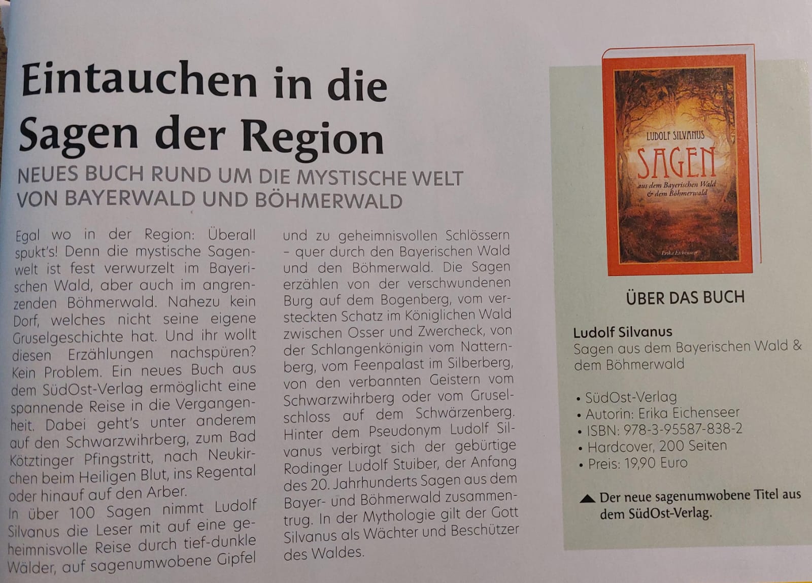 In über 100 Sagen nimmt Ludolf Silvanus die Leser mit auf eine geheimnisvolle Reise durch tief-dunkle Wälder, auf sagenumwobene Gipfel und zu geheimnisvollen Schlössern – quer durch den Bayerischen Wald und den Böhmerwald. Die Sagen erzählen von der verschwundenen Burg auf dem Bogenberg, vom versteckten Schatz im Königlichen Wald zwischen Osser und Zwercheck, von der Schlangenkönigin vom Natternberg, vom Feenpalast im Silberberg, von den verbannten Geistern vom Schwarzwihrberg oder vom Gruselschloss auf dem Schwärzenberg. Hinter dem Pseudonym Ludolf Silvanus verbirgt sich Ludolf Stuiber (* 29.3.1861 in Roding, † 19.1.1939), der Anfang des 20. Jahrhunderts Sagen aus dem Bayer- und Böhmerwald zusammentrug. In der Mythologie gilt der Gott Silvanus als Wächter und Beschützer des Waldes. |