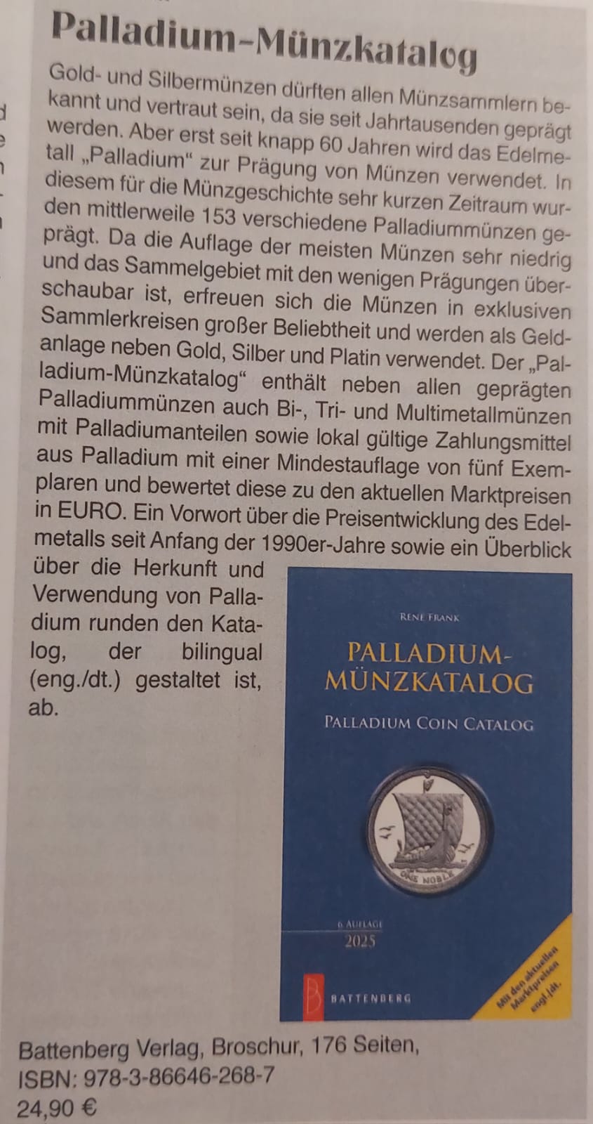 Palladium-Münzkatalog / Palladium Coin Catalog 2025 | René Frank, Palladiummünzen, Palladium, Multimetallprägungen, Edelmetalle, Bimetallprägungen, Gold, Stempelvarianten, Zahlungsmittel, Australien, Kanada, Europa, Afrika, USA, Münzprägung, Münzgeschichte, Marktpreise, Coin, deutsch-englisch, Geldanlage, Münzkatalog | Gold- und Silbermünzen dürften allen Münzsammler bekannt und vertraut sein, da sie seit Jahrtausenden geprägt werden. Aber erst seit knapp 60 Jahren wird das Edelmetall „Palladium“ zur Prägung von Münzen verwendet. In diesem für die Münzgeschichte sehr kurzen Zeitraum wurden mittlerweile 153 verschiedene Palladiummünzen geprägt. Da die Auflage der meisten Münzen sehr niedrig und das Sammelgebiet mit den wenigen Prägungen überschaubar ist, erfreuen sich die Münzen in exklusiven Sammlerkreisen großer Beliebtheit und werden als Geldanlage neben Gold, Silber und Platin verwendet. Der „Palladium-Münzkatalog“ enthält neben allen geprägten Palladium münzen auch Bi-, Tri- und Multimetallmünzen mit Palladiumanteilen sowie lokal gültige Zahlungsmittel aus Palladium mit einer Mindestauflage von 5 Exemplaren und bewertet diese zu den aktuellen Marktpreisen in EURO. Ein Vorwort über die Preisentwicklung des Edelmetalls seit Anfang der 1990er-Jahre sowie ein Überblick über die Herkunft und Verwendung von Palladium runden den Katalog, der bilingual (eng./dt.) gestaltet ist, ab. | palladium-muenzkatalog | Palladium-Münzkatalog | Palladium Coin Catalog | /uploads/produkt/palladium-muenzkatalog/palladium-muenzkatalog-default-2025-06-05-121405.jpg | 24.90 | 268 | 12,5 x 19 | 978-3-86646-268-7 | 6/2025 | |||||||||||||