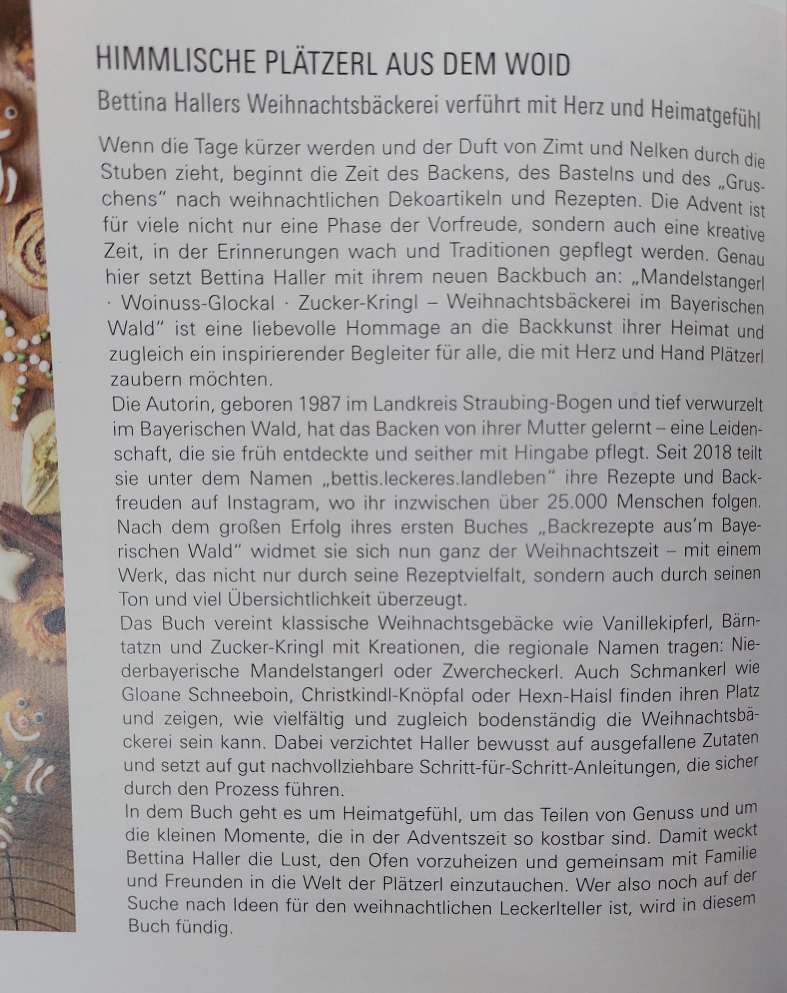 Weihnachtsbäckerei im Bayerischen Wald. Mandelstangerl, Woinuss-Glockal, Zucker-Kringl – kreative Backrezepte für Plätzerl & andere weihnachtliche Schmankerl | Kreativ backen Ostbayern Platzerl Oberpfalz Freyung-Grafenau Landfrauenküche Osser Instagram Plätzchen Straubing-Bogen Arberland Influencer Passau Landkreis Regen Niederbayern Backbuch Landkreis Cham Rezepte Dahoam Bettis leckeres Landleben Bayerischer Wald Ideen Bayern Kleingebäck Landfrauen Backen Bayerwald Modern Plätzchen backen schnelle Rezepte Regional Bairisch Gebäck Arber Deggendorf Weihnachtsbackbuch Weihnachten Advent Plätzchenteig Spritzgebäck Ausstechplätzchen Anleitungen Lebkuchen Vanillekipferl Spitzboam | Wenn die Weihnachtszeit näher rückt, „gruscht“ man wieder seine Weihnachts-Backbücher hervor, um in der Adventszeit einen schönen Plätzerl-Teller zu haben. Aber die Frage der Fragen: Welche Plätzerl sollen es werden? Nach dem riesigen Erfolg ihres ersten Backbuches widmet sich Bettina Haller, die leidenschaftliche Kuchenbäckerin aus dem Bayerischen Wald, nun der Weihnachtszeit. Mehr als 25.000 Menschen folgen ihr mittlerweile auf Instagram. Auf ihrem Account bettis.leckeres.landleben präsentiert sie seit vielen Jahren feinste Rezepte und teilt wertvolle Tipps & Tricks mit ihren Followern. In ihrem neuen Weihnachts-Backbuch findest du: • bewährte Klassiker – von Vanillekipferl bis Spitzboum • innovative & neu interpretierte Rezepte • Rezepte, die ohne ausgefallene Zutaten auskommen • gut nachvollziehbare Schritt-für-Schritt-Anleitungen & wertvolle Tipps Mit diesem Buch schaffst auch du es, für dich und deine Lieben himmlische Weihnachts-Schmankerl zu zaubern! | weihnachtsbaeckerei-im-bayerischen-wald | Weihnachtsbäckerei im Bayerischen Wald | Mandelstangerl, Woinuss-Glockal, Zucker-Kringl – kreative Backrezepte für Plätzerl & andere weihnachtliche Schmankerl | /uploads/produkt/weihnachtsbaeckerei-im-bayerischen-wald/weihnachtsbaeckerei-im-bayerischen-wald-default-2025-06-05-115342.jpg | 24.90 | 644 | 17 x 24 | 978-3-95587-836-8 | 1. Auflage 2025 | |||||||||||||
