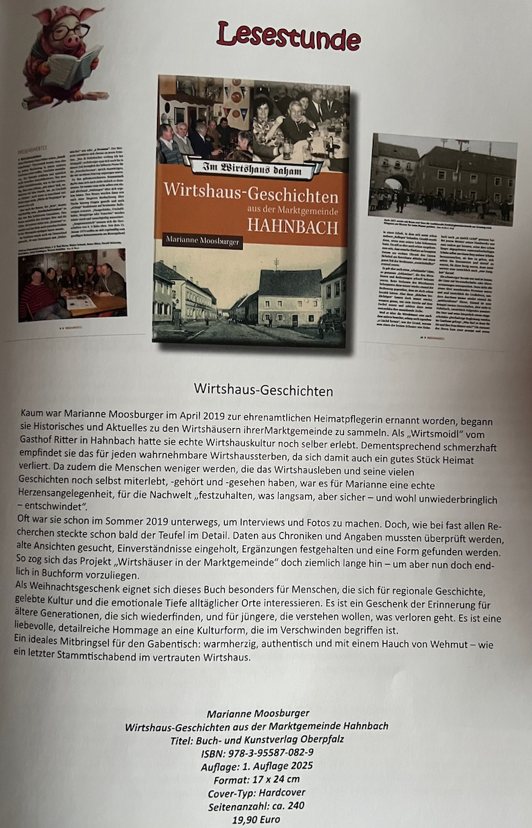 Wirtshaus-Geschichten aus der Marktgemeinde Hahnbach | Marianne Moosburger (geb. 1955) ist die Tochter der Wirtsleute Anton und Anna Ritter. Sie ist im Gasthof und der Brauerei Ritter in der Hauptstraße 25 in Hahnbach aufgewachsen. Seit April 2019 ist sie Heimatpflegerin von Hahnbach. Jahrelang sammelte sie in der Marktgemeinde alte und neuere Wirtshausgeschichten sowie unzählige Fotos. Über 49 verschiedene Wirtschaften aus 23 Orten kann man nun in Orts- und Wirtshausgeschichten und vielen humorigen Anekdoten nachlesen. Zudem informieren zahlreiche Artikel über Wissenswertes und auch viel Unbekanntes „rund ums Bier“. Man taucht ein ins Wirtshausleben von früher und liest Interessantes übers Brauen in Hahnbach und der Oberpfalz. Auch die Bierprüfer, eine Wirtshausordnung, Raufereien, Eisweiher, Bierkeller und vieles mehr sind im Buch zu finden. Entdecken Sie hier manches schon (fast) Vergessene, Witzige, Informative, aber auch durchaus Skurrile aus der Wirthauskultur „rundumadum“ Hahnbach! | wirtshaus-geschichten-aus-der-marktgemeinde-hahnbach | Wirtshaus-Geschichten aus der Marktgemeinde Hahnbach | /uploads/produkt/wirtshaus-geschichten-aus-der-marktgemeinde-hahnbach/wirtshaus-geschichten-aus-der-marktgemeinde-hahnbach-default-2025-10-07-121158.jpg | 19.90 | 920 | 17 x 24 | 978-3-95587-082-9 | 1. Auflage 2025 | deutsch | ||||||||||||||