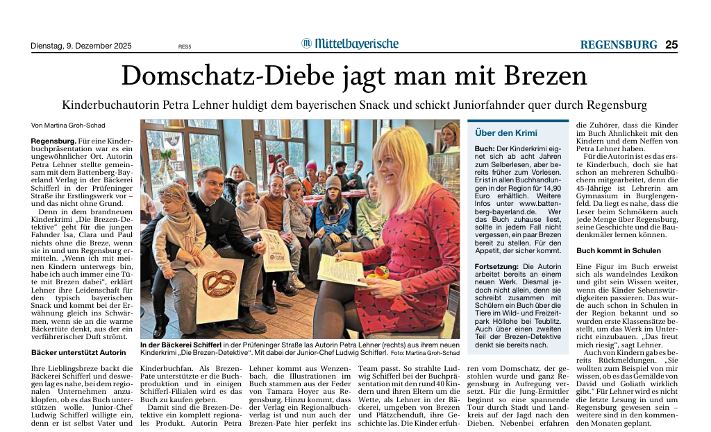 Die Brezen-Detektive und der verschwundene Domschatz. Regensburger Kinder-Krimi, | Eigentlich wollen Isa, Clara und Paul nur einen gemütlichen Samstag in Regensburg verbringen. Doch plötzlich geraten sie in einen spektakulären Kriminalfall: Der Regensburger Domschatz wurde gestohlen! Die ganze Stadt ist im Ausnahmezustand … Eine gefährliche Verfolgungsjagd beginnt und führt die drei Kinder quer durch die Stadt und den Landkreis Regensburg. Dabei entdecken sie nicht nur zahlreiche Spuren, sondern ganz nebenbei auch die vielen Sehenswürdigkeiten der Region. Doch wird es ihnen auch gelingen, ihren ersten Fall zu lösen? Mit Illustrationen von Tamara Hoyer | die-brezen-detektive-und-der-verschwundene-domschatz | Die Brezen-Detektive und der verschwundene Domschatz | Regensburger Kinder-Krimi // Lesealter ab 8 Jahren | /uploads/produkt/die-brezen-detektive-und-der-verschwundene-domschatz/die-brezen-detektive-und-der-verschwundene-domschatz-default-2025-10-07-114716.jpg | 14.90 | 351 | 13,5 x 20,5 | 978-3-95587-446-9 | 1. Auflage 2025 | 17.11.2025 | deutsch | ||||||||||||