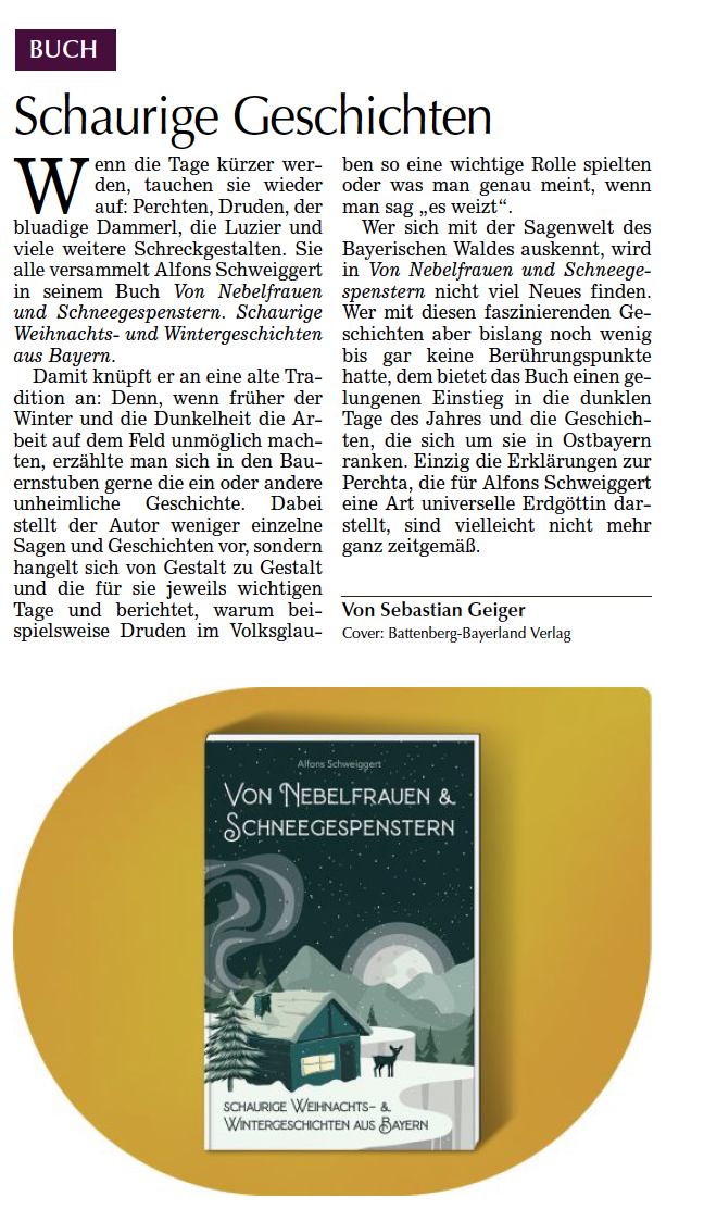Von Nebelfrauen und Schneegespenstern – schaurige Weihnachts- & Wintergeschichten aus Bayern von Alfons Schweiggert | Märchen Sagen Weihnachten Bayern Legenden Spuk Geschichten Spukgeschichten unheimliche Geschichten mystisch Schauergeschichten Schauermärchen Brauchtum unheimlich Advent, Perchten, Spannung, Grusel, gruselig, Gruselgeschichten, Weihnachten, Fantasy, fantastische, Geschichten, mysteriös, Hexen, Werwölfe, Teufel, Rauhnacht, Wintergeschichten, alte Bräuche, Gestalt, schaurig | Die Weihnachtszeit in Bayern ist nicht nur eine heimelige Zeit, in der man sich um den Adventskranz schart und märchenhaften Geschichten lauscht. Die Wochen von Allerheiligen bis zum Heiligedreikönigstag waren schon immer auch eine Zeit, die vom Glauben an dunkle Wesen geprägt war… Die kürzer werdenden Tage, das Absterben der Natur, die sich ausbreitende Kälte und lange, stürmische Nächte regten die Fantasie der Menschen an. In den Köpfen der Leute entstanden eigenartige unheimliche Wesen; heidnische und christliche Gestalten begannen sich zu vermischen. Nebelfrauen und Schneegespenster „weizten“, trieben also ihren Spuk ebenso wie Windsbräute und Sturmdämonen. Die Toten geister kehrten wieder und andere dunkle Gestalten standen auf, so der Hargeist, die Wildbärbel, die zottigen Klaubaufs, die Schiache Luz und der Bluadige Thamerl. Ebenso ängstigte man sich vor Teufeln, Hexen und Druden. Werwölfe und Haberngoaßn trieben ihr Unwesen. In der dämonischen Zwölfenzeit, wie die Nächte vom 25. Dezember bis zum 6. Januar heißen, führten Heidengötter, allen voran die Frau Percht und der Wot die „Wilde Jagd“ an. Mit den Unschuldigen Kindln und dem Zwoagsicht Janus klang das Jahr aus, das in der Dreikini-Rauhnacht nochmals einen eindrucksvollen Höhepunkt, Abschluss und gleichzeitig Neubeginn erlebte. Noch heute lassen Perchtenbünde und Rauhnachts-Gruppen die alten Bräuche, die lange Zeit vergessen schienen, wieder eindrucksvoll aufleben. Der bekannte Autor Alfons Schweiggert erweckt in seinem neuen Buch sagenhafte Gestalten und alte Bräuche der winterlichen Zeit zum Leben – in schaurig-gruseligen Geschichten … | von-nebelfrauen-und-schneegespenstern | Von Nebelfrauen und Schneegespenstern | Schaurige Weihnachts- & Wintergeschichten aus Bayern | /uploads/produkt/von-nebelfrauen-und-schneegespenstern/von-nebelfrauen-und-schneegespenstern-default-2025-06-05-113546.jpg | 19.90 | 406 | 13,5 x 20,5 | 978-3-89251-553-1 | 1. Auflage 2025 | |||||||||||||