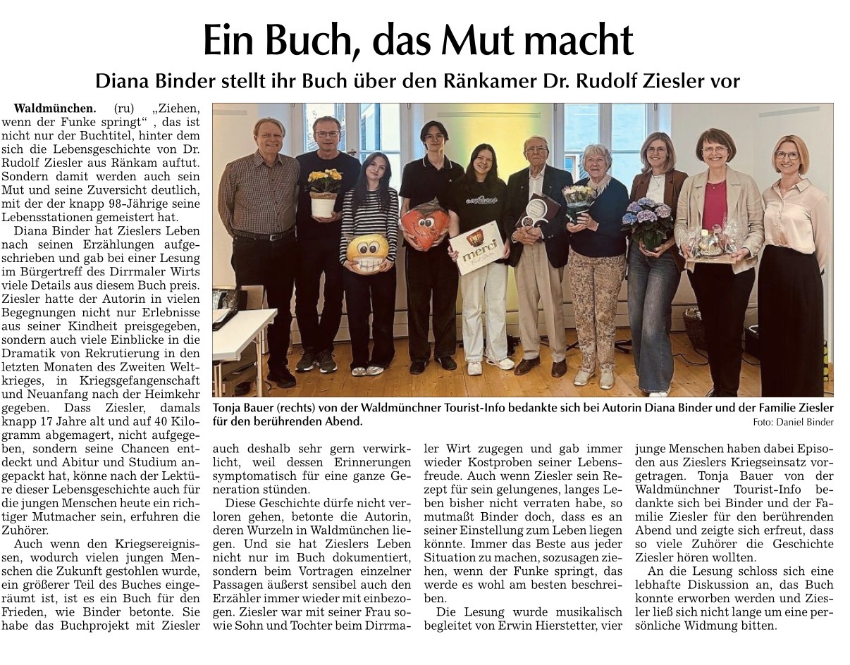 Dr. Rudolf Ziesler, 1928 geboren im bayerischen Ränkam, wächst auf in einer Welt im Wandel. Mit gerade 16 Jahren wird er aus dem Klassenzimmer in den Krieg geschickt – und kehrt geprägt von den Schrecken der Gefangenschaft zurück in ein Land im Wiederaufbau. Mit Disziplin, Bildungshunger und einer gehörigen Portion Entscheidungsfreude arbeitet er sich vom einfachen Bauernsohn zum promovierten Bankdirektor hoch. Er gründet eine Familie, baut sich eine angesehene Existenz auf und kehrt immer wieder zurück zu den Wurzeln in seiner Heimat. Hier blickt er mit 97 Jahren als einer der noch wenigen lebenden Zeitzeugen des Bayerischen Waldes zurück auf eine Epoche, die mehr und mehr in Vergessenheit gerät. Ein Zitat aus seinem Lieblingsbuch „Antonio Adverso“ steht dabei gleichsam als sein Lebensmotto: „Ziehen, wenn der Funke springt“ – oder übertragen: Es liegt an jedem selbst, an seiner Situation zu verzweifeln, oder das Beste aus seinem Leben zu machen. Autorin Diana Binder erzählt die Geschichte eines entschlossenen und klugen Mannes, der sich detailreich an ein bewegtes Leben erinnert – und dabei auch ein lange gehütetes Familiengeheimnis offenbart. Eine authentische Erzählung voller Zeitgeschichte! "Nicht jammern, sondern anpacken, um das Beste aus den Chancen zu machen, die sich bieten: Dr. Zieslers Weg steht für das, was unsere Region stark macht." (Franz Löffler, Bezirkstagspräsident Oberpfalz)